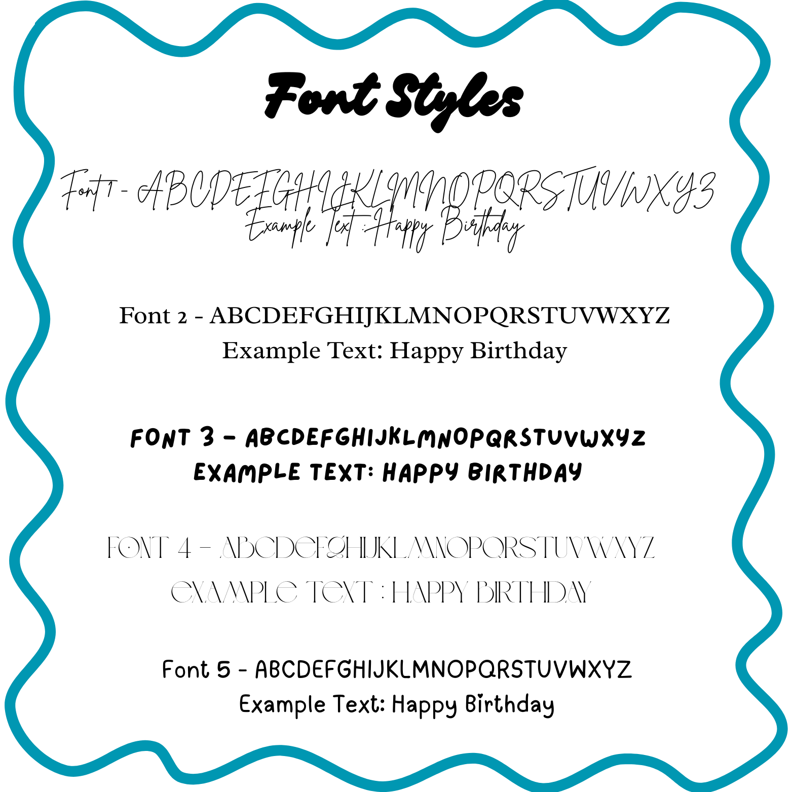 - Include your chosen font: Font 1, Font 2, Font 3, Font 4 or Font 5